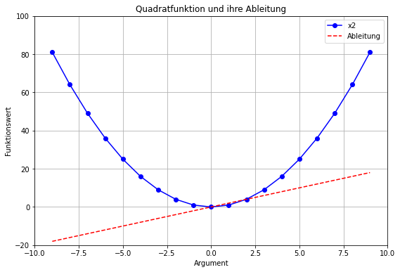 Plotten Sie die Quadratfunktion \(\sf f(x) = x^2\) und ihre analytische Ableitung für Werte im Bereich \(\sf x \in [-9,9]\). Dabei sollte \(\sf f(x)\) mit Punkten und durchgezogener Linie in blauer Farbe und die Ableitung als gestrichelte Linie in roter Farbe dargestellt sein. Die x-Achse des gezeichneten Koordinatensystems soll Werte von -10 bis 10 und die y-Achse von -20 bis 100 aufgetragen haben. Weiterhin sind beide Funktionen mittels Legende zu beschriften und Achsenbeschriftung, ein Graphiktitel und ein Gitternetz einzufügen. Der finale Plot soll als Bilddatei abgespeichert werden.